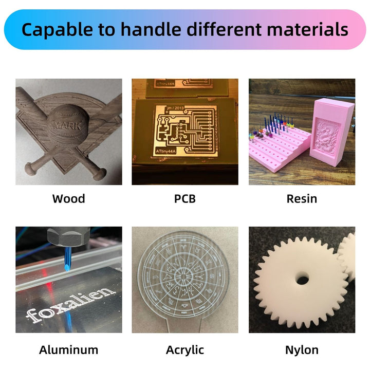 - Masuter 4040 is capable to engrave, cut and drill many kinds of material such as wood, MDF, acrylic, foam, resin, nylon, PCB, and aluminum etc.