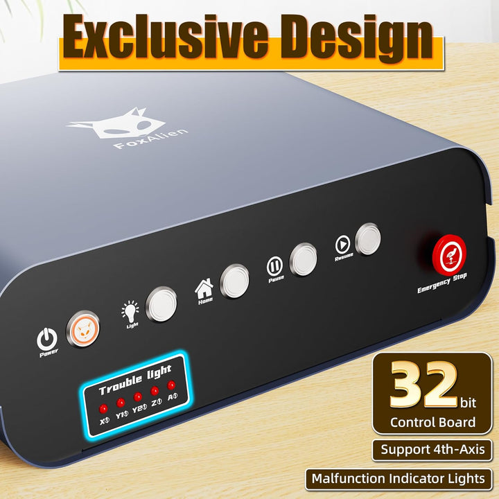 - Smart 32-Bit Control Box: Features real-time stepper motor diagnostics via malfunction indicator lights for streamlined troubleshooting. There is a reserved port for 4th axis (coming soon).