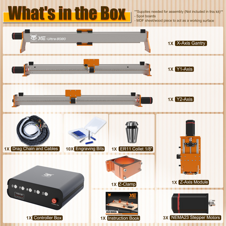 - Open Spindle Ecosystem: Total flexibility on spindle choices. Customize your setup—supports 65mm routers, FoxAlien 1.5kW VFD spindle, or FA20W/40W/80W engraving modules (65mm clamp included, this bundle kit includes the 1.5KW VFD Spindle Kit).