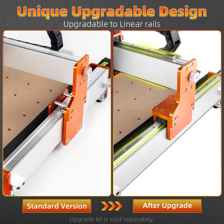 [Upgradable] Exclusive innovative design for linear rails upgrade on XY axis. The XE-PRO can be turned into an industrial grade home use machine after installing the linear rails on X and Y axis. This innovative design is really friendly to new users, they don't need to purchase another new machine with linear rails after they master the CNC skill. The XE-PRO also comes with a 65mm and 69mm clamp, which can compatible with Makita Router RT0700C and DeWalt DWP611 Router.