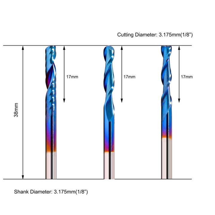 【1/8” Shank; 1/8” Cutting Edge】Both shank size and cutting edge size are 1/8 inch (3.175mm). Commonly used in CNC router.