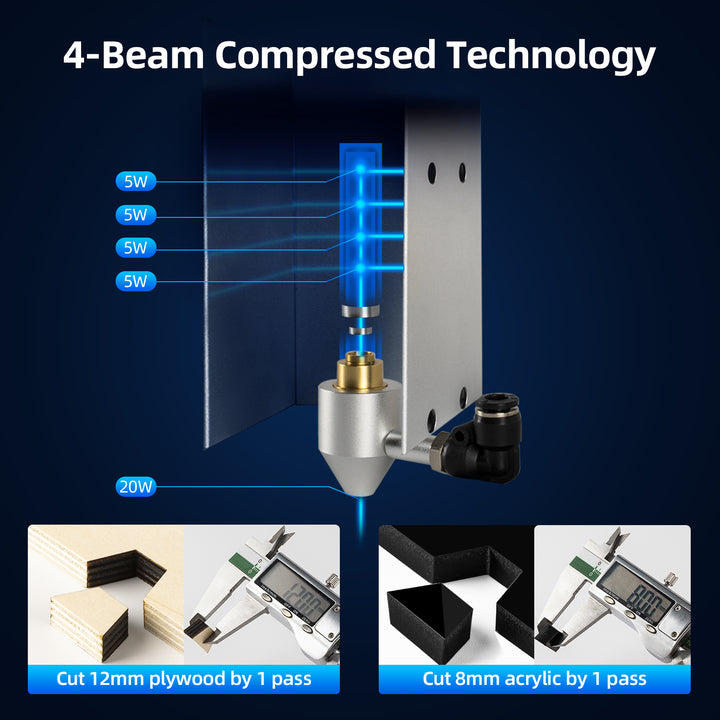 - 10mm real hardwood cuts in one-pass by 20W Highest Dual Laser.
