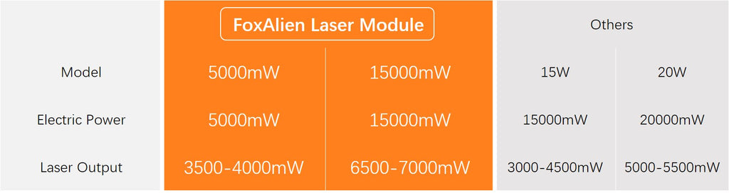 Detachable Laser ModuleIt comes with a 2021 New 5000mW Fixed Focus laser head. Focal distance is 30mm. The height of the laser module is adjustable by the knobs.