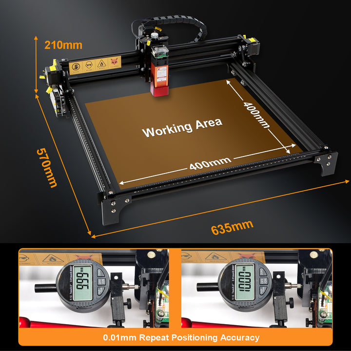 • 【Compressed laser beam technology】It has a 40W fixed-lens laser module with laser beam compression technology. The laser dot is only 0.2*0.15mm. This laser module has great performance in cutting and engraving, especially engraving delicate projects and details.