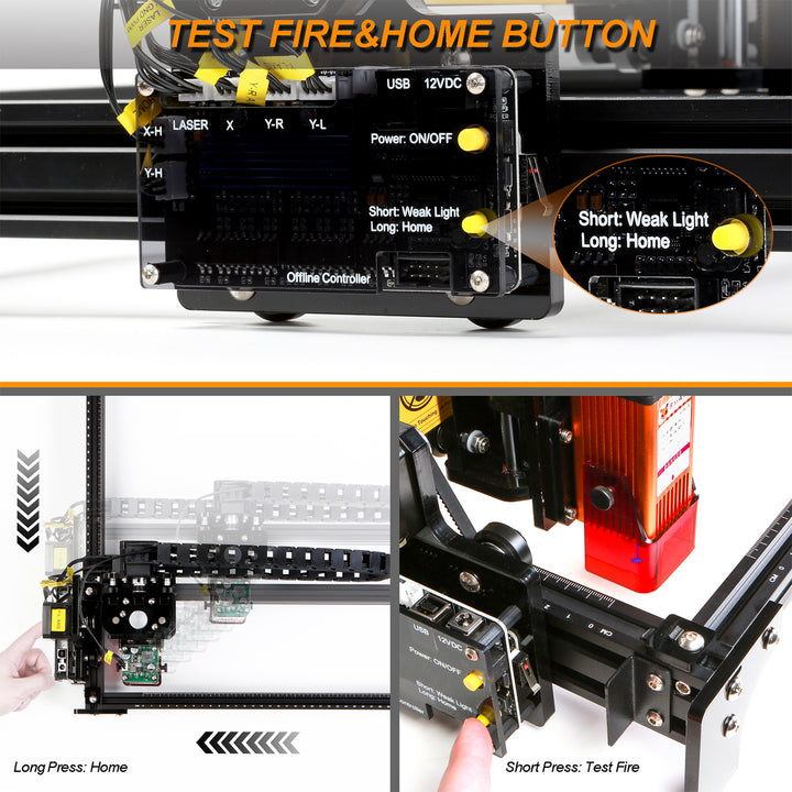 • 【One-click to HOME & Test fire button】HOME and test fire function are integrated to the control board. Long press to HOME; short press to turn on the laser in weak light.