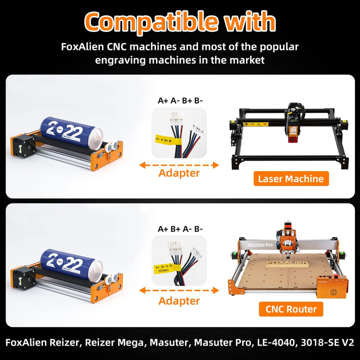 - Two adapter wires are included: one is A+A-B+B-, and the other one is A+B+A-B-. With these wires, the rotary roller is basically compatible with all brand of engraving machines.