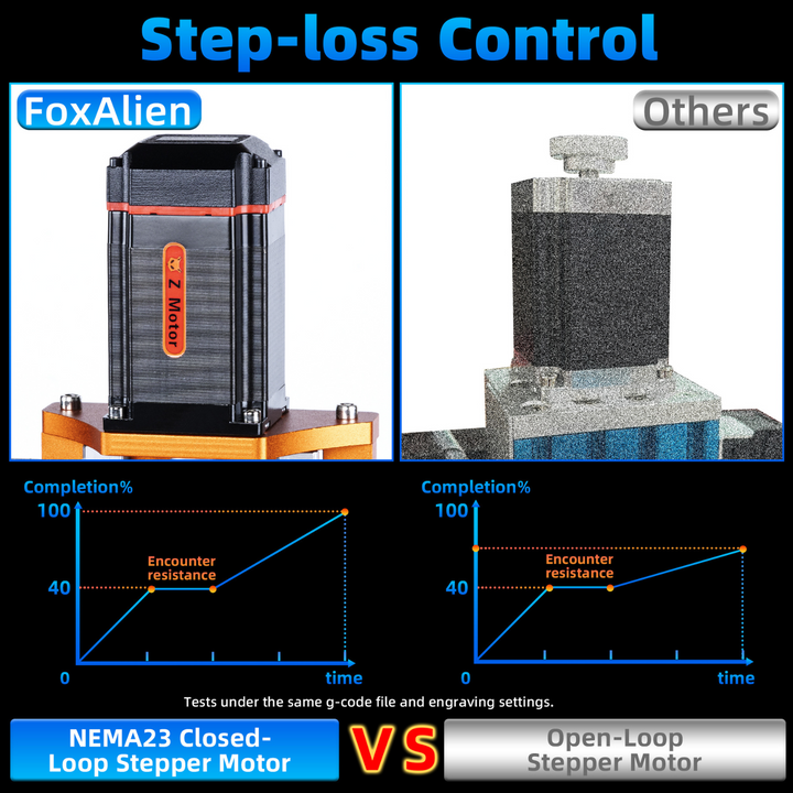 The Masuter 3S is the first CNC Router comes with the four Nema23 Closed Loop Motors at a price under $1000 in the market. It is the latest model in the FoxAlien CNC Router's family in 2024. Equipped with 400W spindle and four Nema23 Closed Loop Stepper Motors(max torque 2.2Nm) which make the machine powerful enough to achieve a nice finish on wood, acrylic, carbon fiber, and soft metal. The max moving speed of the Masuter 3S is 10000mm/min, this can reduce a lot of time when the machine needs to run a laser engraving project. If you are looking for a CNC for both wood carving and laser engraving jobs, the Mastuer 3S is the best choice.