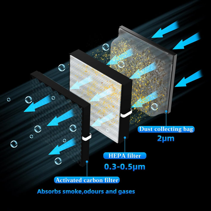 This kit includes 1 dust collector bag, 1 HEPA filter, 1 activated carbon filter.