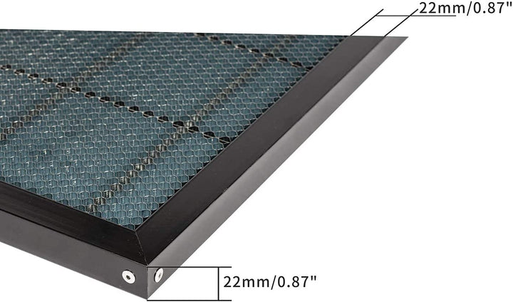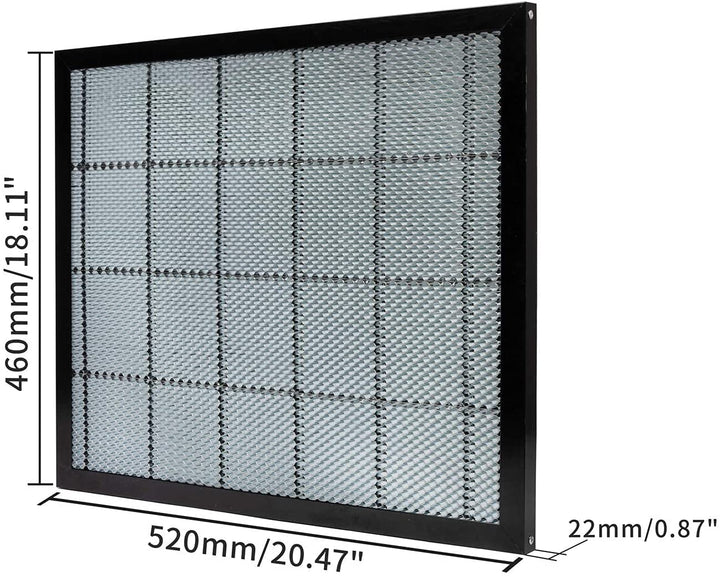 • The size of the work bed is 20.47x18.11x0.87 inch (52x46x2.2 cm, L*W*H). Honeycomb diameter is 0.3 inch (7.5mm).